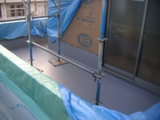 (バルコニー、2階のブルーシートは防水紙を貼るまでの雨対策の養生です。)
